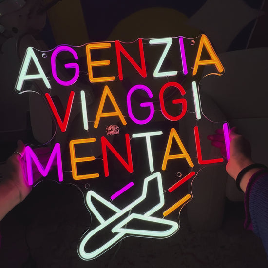 Scrittina led "AGENZIA VIAGGI MENTALI", composta al 40% di imprecazioni e al 60% di luminosità.