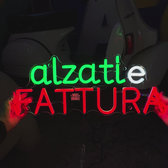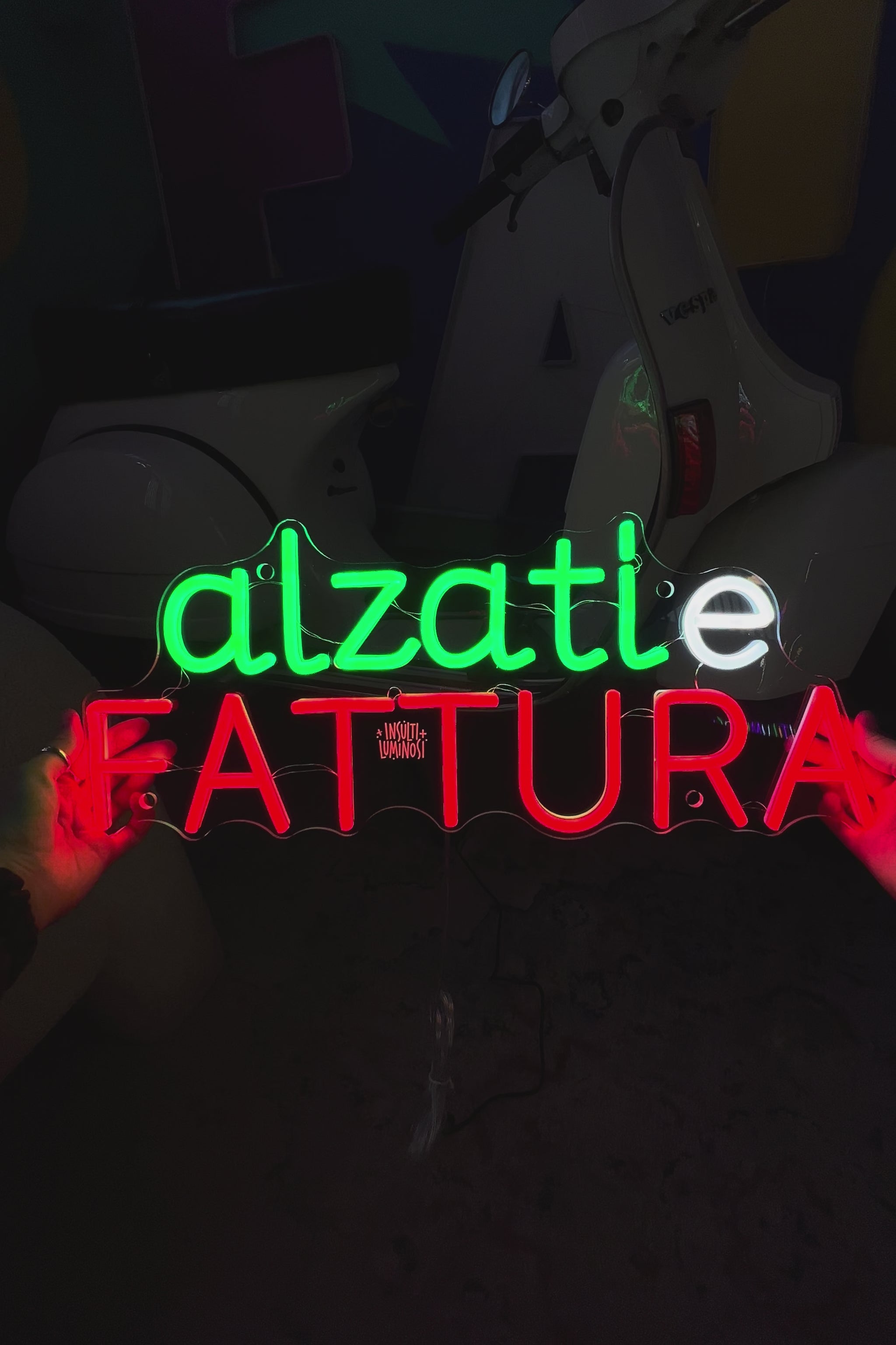 Scrittina led "ALZATI E FATTURA", composta al 40% di imprecazioni e al 60% di luminosità.