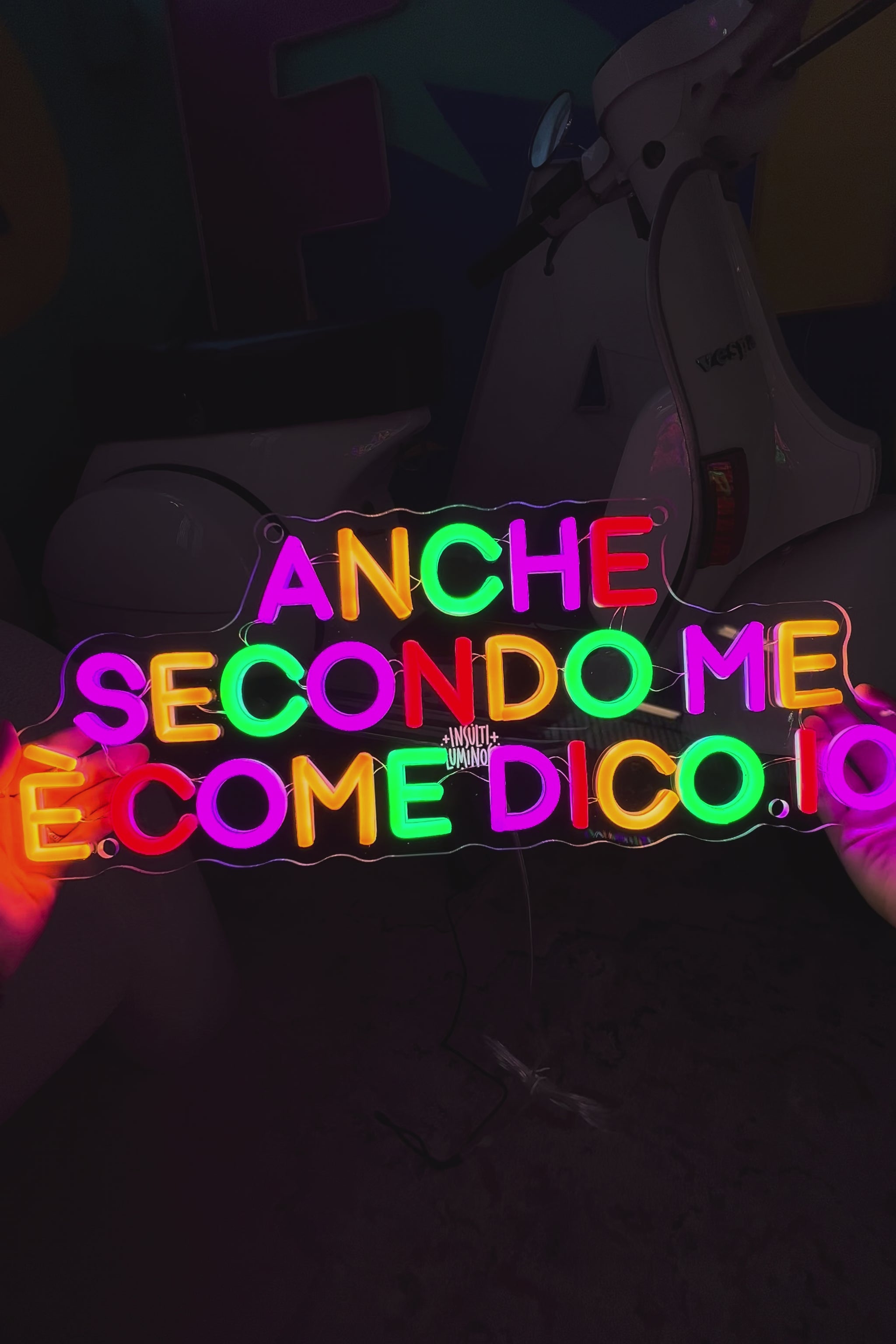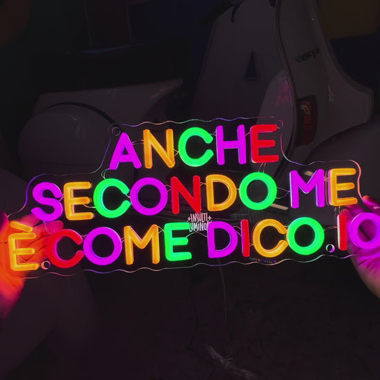 Scrittina led "ANCHE SECONDO ME È COME DICO IO", composta al 40% di imprecazioni e al 60% di luminosità.