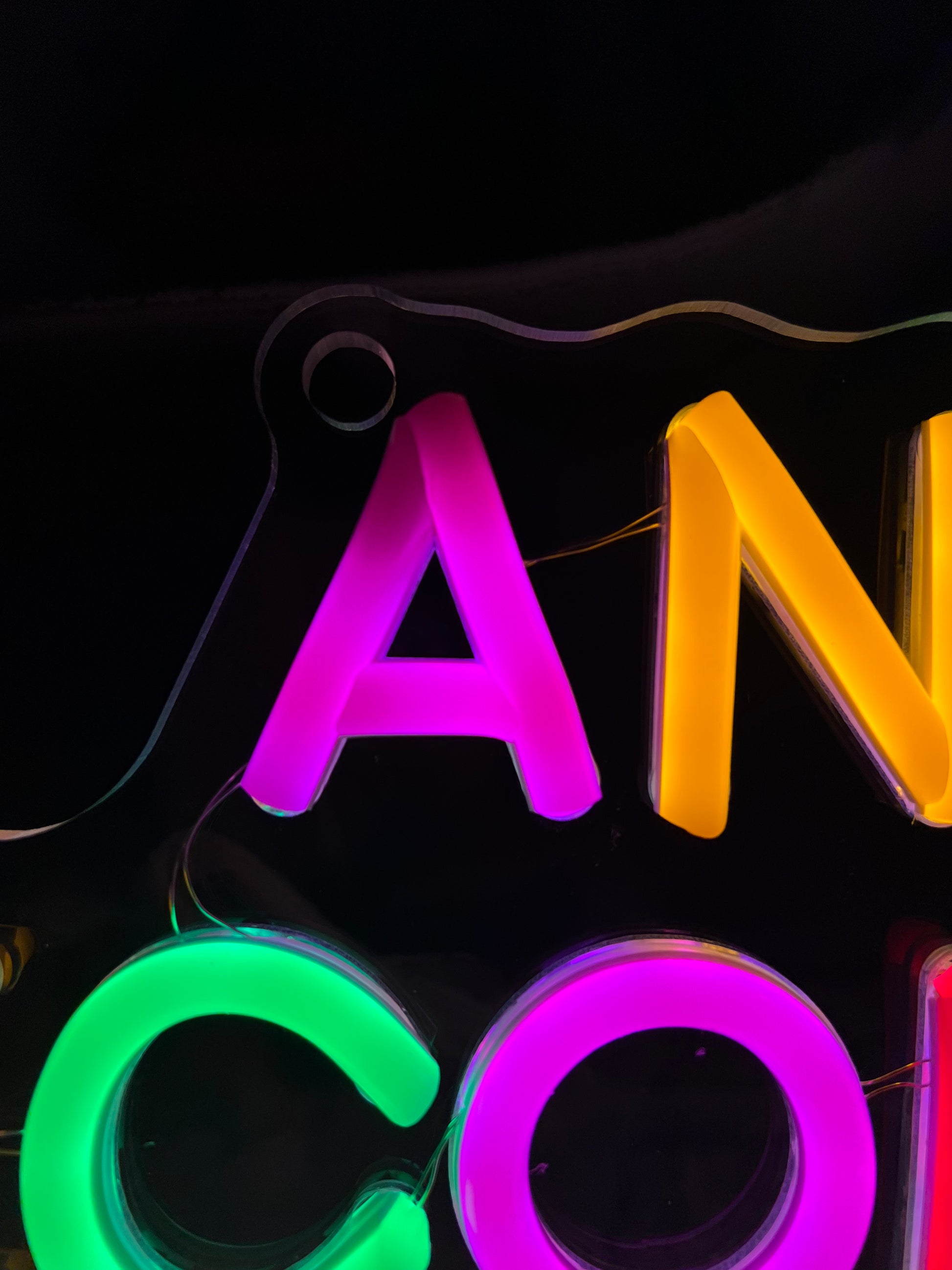 Scrittina led "ANCHE SECONDO ME È COME DICO IO", composta al 40% di imprecazioni e al 60% di luminosità.