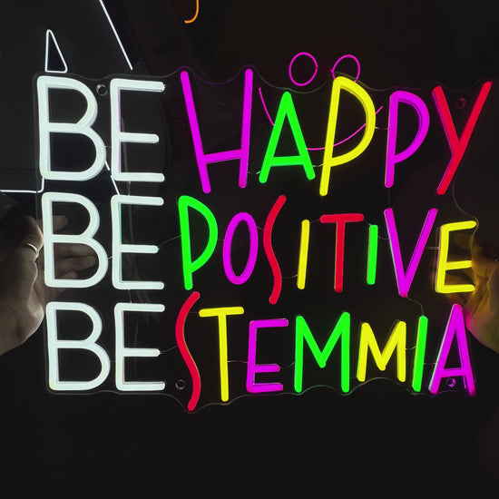 Scrittina led "BE HAPPY BE POSITIVE BE STEMMIA", composta al 40% di imprecazioni e al 60% di luminosità.
