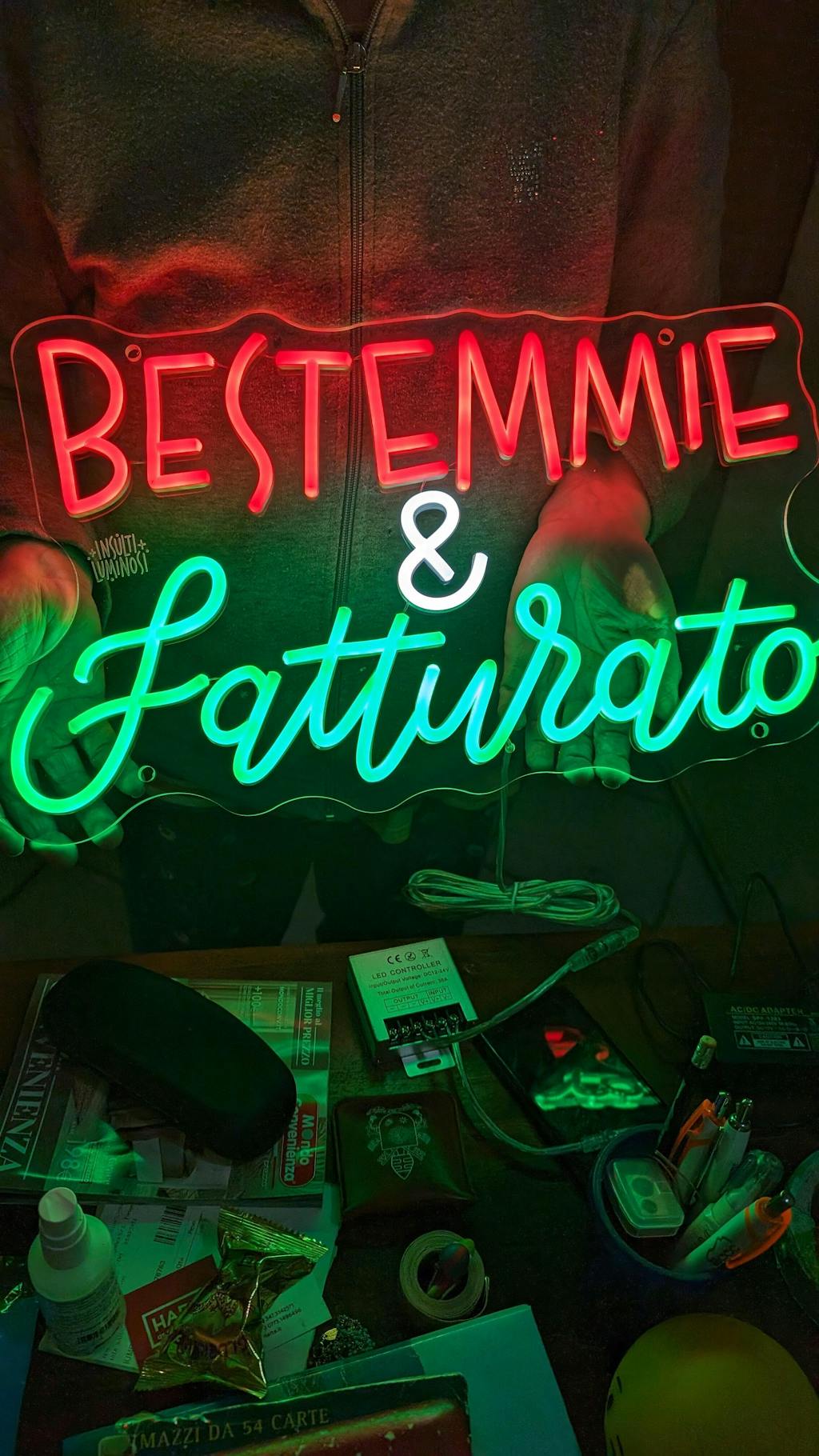L'insegna è alimentata a corrente tramite alimentatore 12V nero compreso nella confezione con cavo di 180cm e spina italiana.