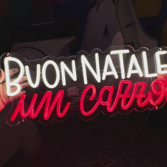Scrittina led "BUON NATALE UN CAZZO", composta al 40% di imprecazioni e al 60% di luminosità.