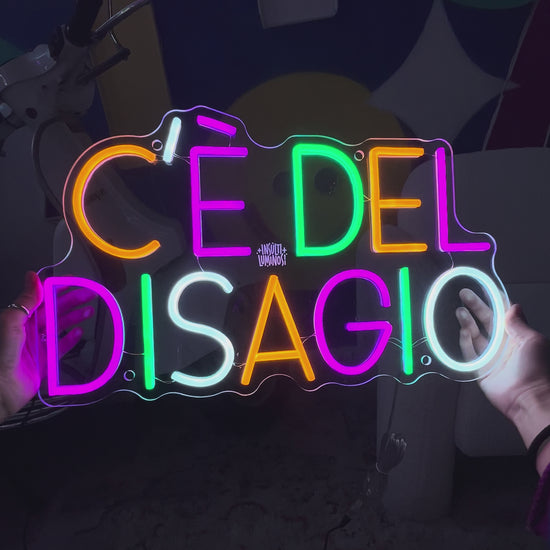 Scrittina led "C'È DEL DISAGIO", composta al 40% di imprecazioni e al 60% di luminosità.