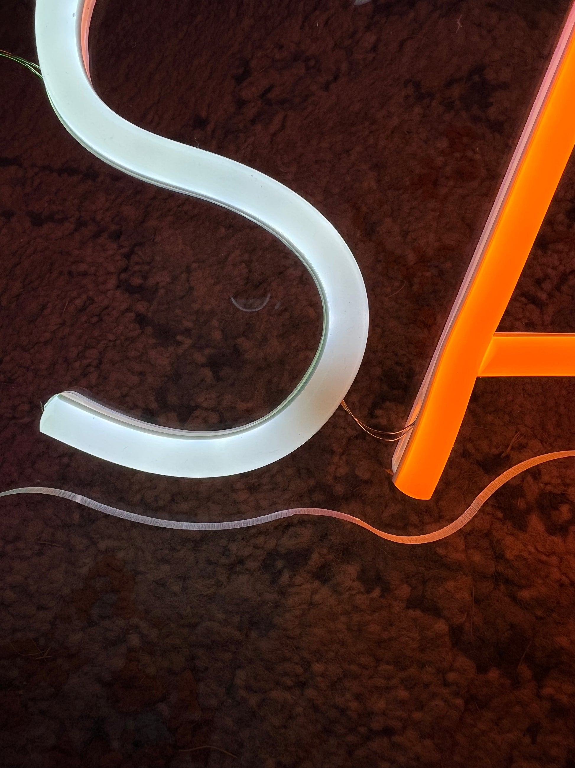 Scrittina led "C'È DEL DISAGIO", composta al 40% di imprecazioni e al 60% di luminosità.