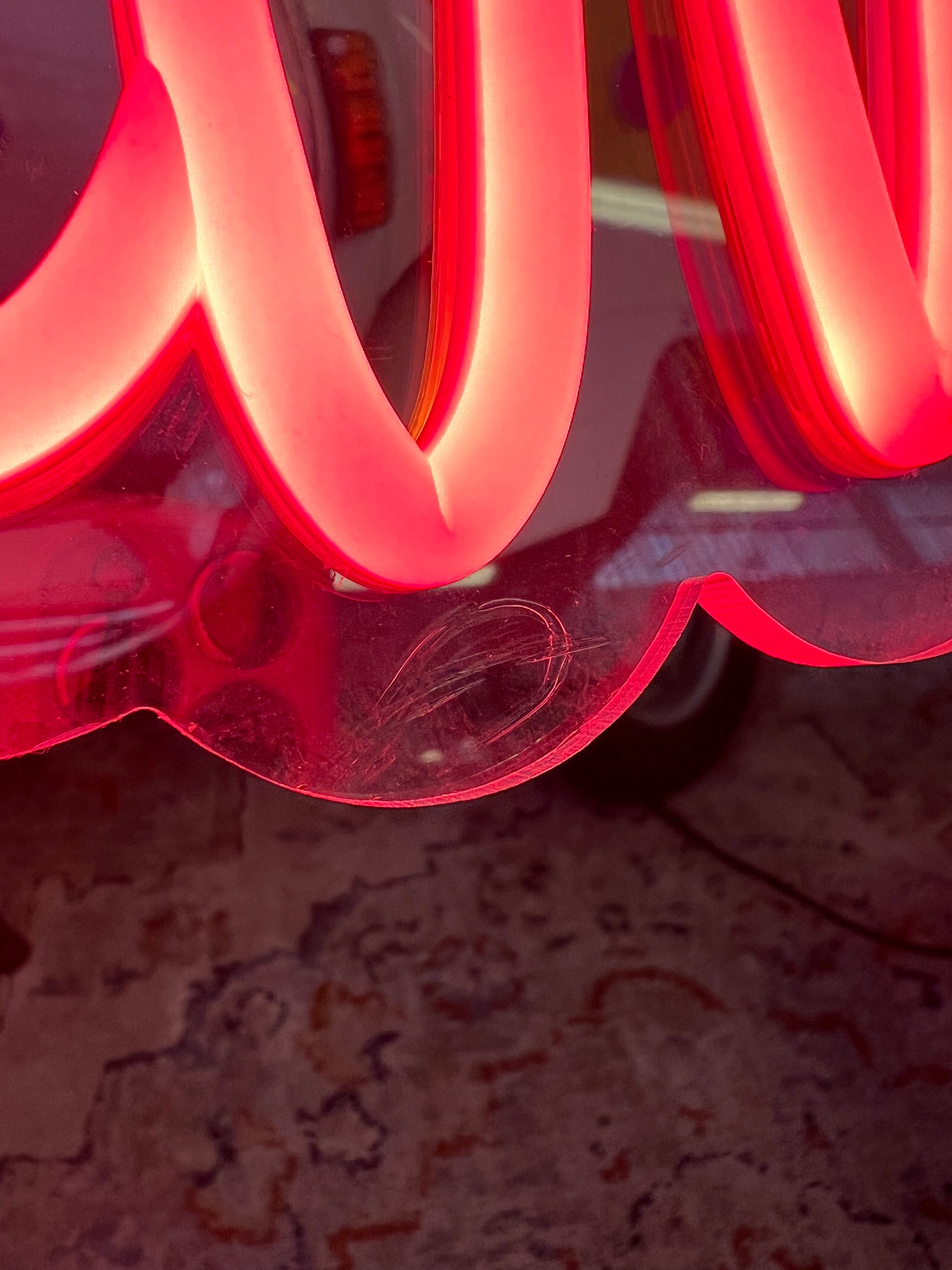 Scrittina led "FELICI & CONTANTI", composta al 40% di imprecazioni e al 60% di luminosità.