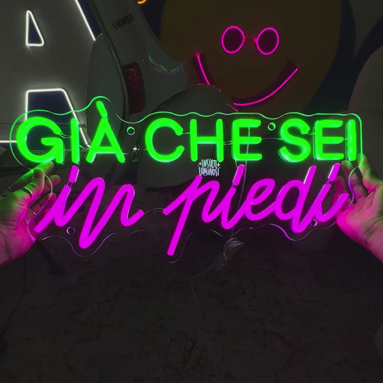 Scrittina led "GIÀ CHE SEI IN PIEDI", composta al 40% di imprecazioni e al 60% di luminosità.