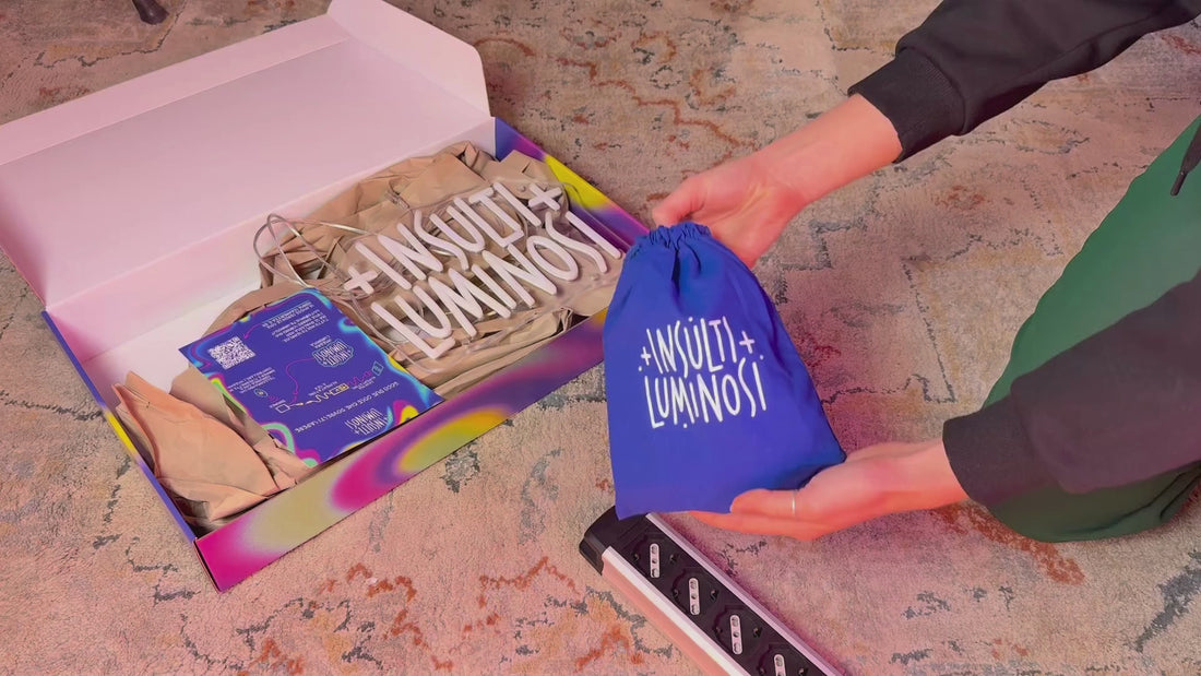 L'insegna è alimentata a corrente tramite alimentatore 12V nero compreso nella confezione con cavo di 180cm e spina italiana.
