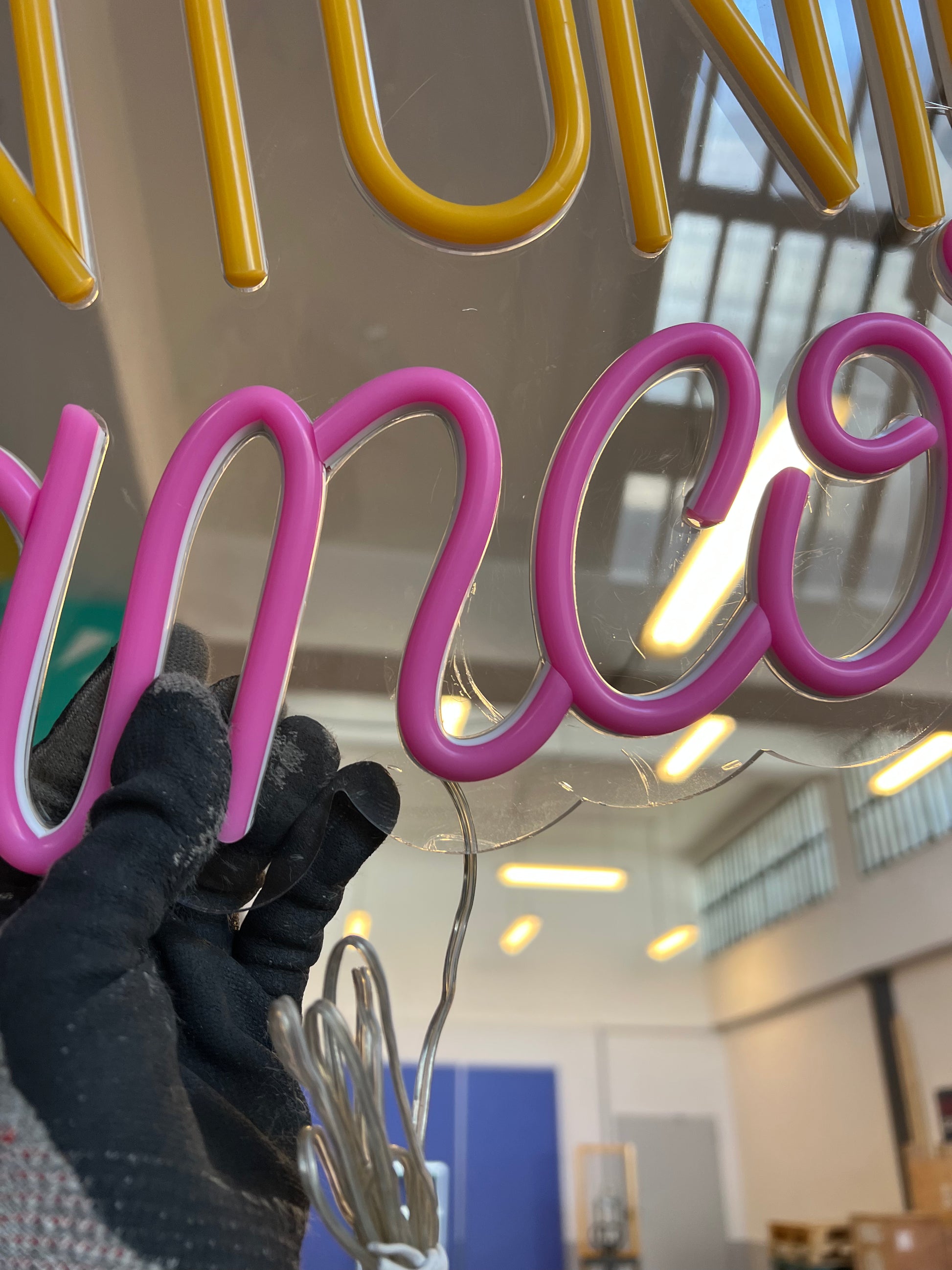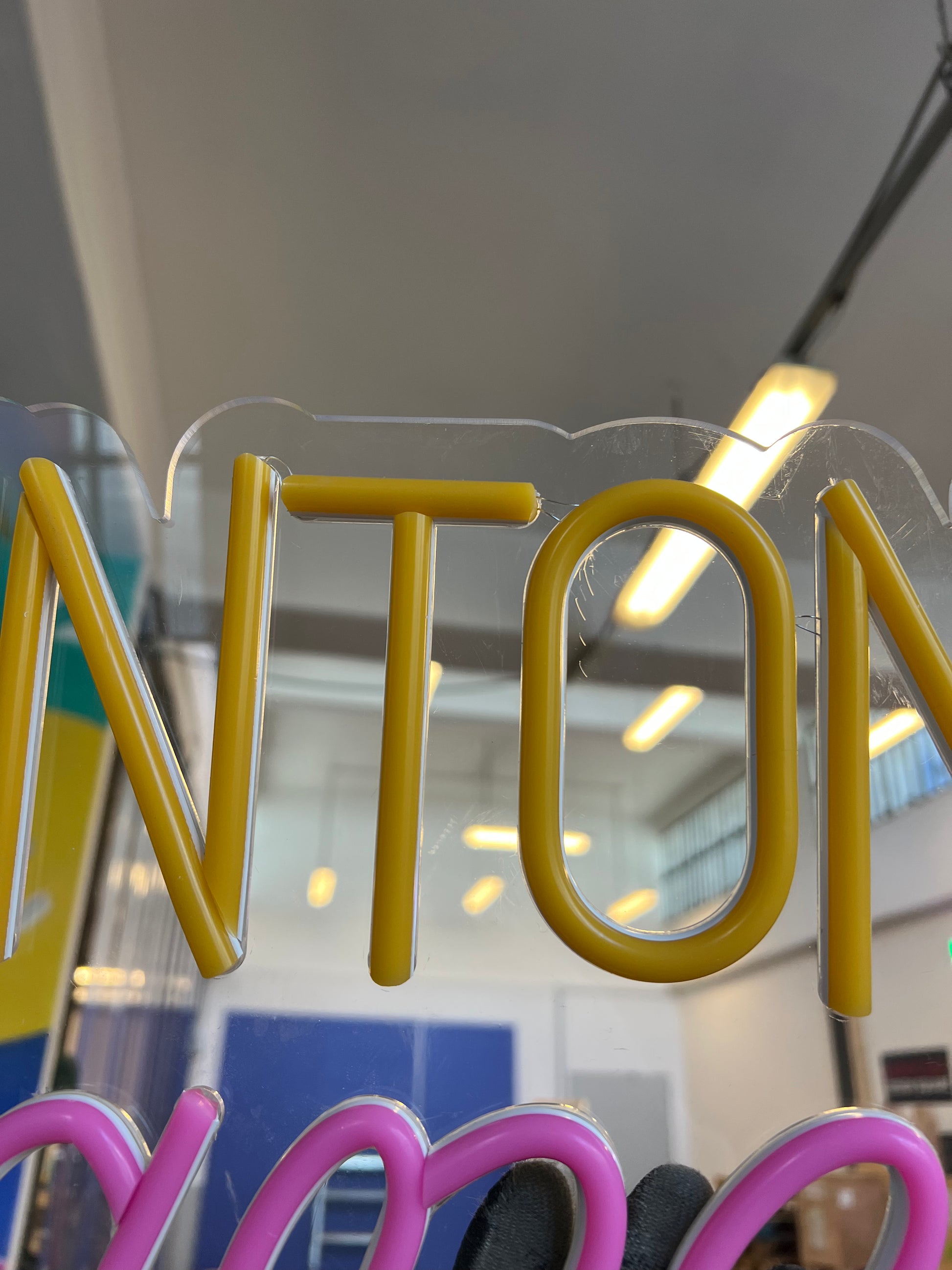 Scrittina led "GINTONIC & RANCORE", composta al 40% di imprecazioni e al 60% di luminosità.