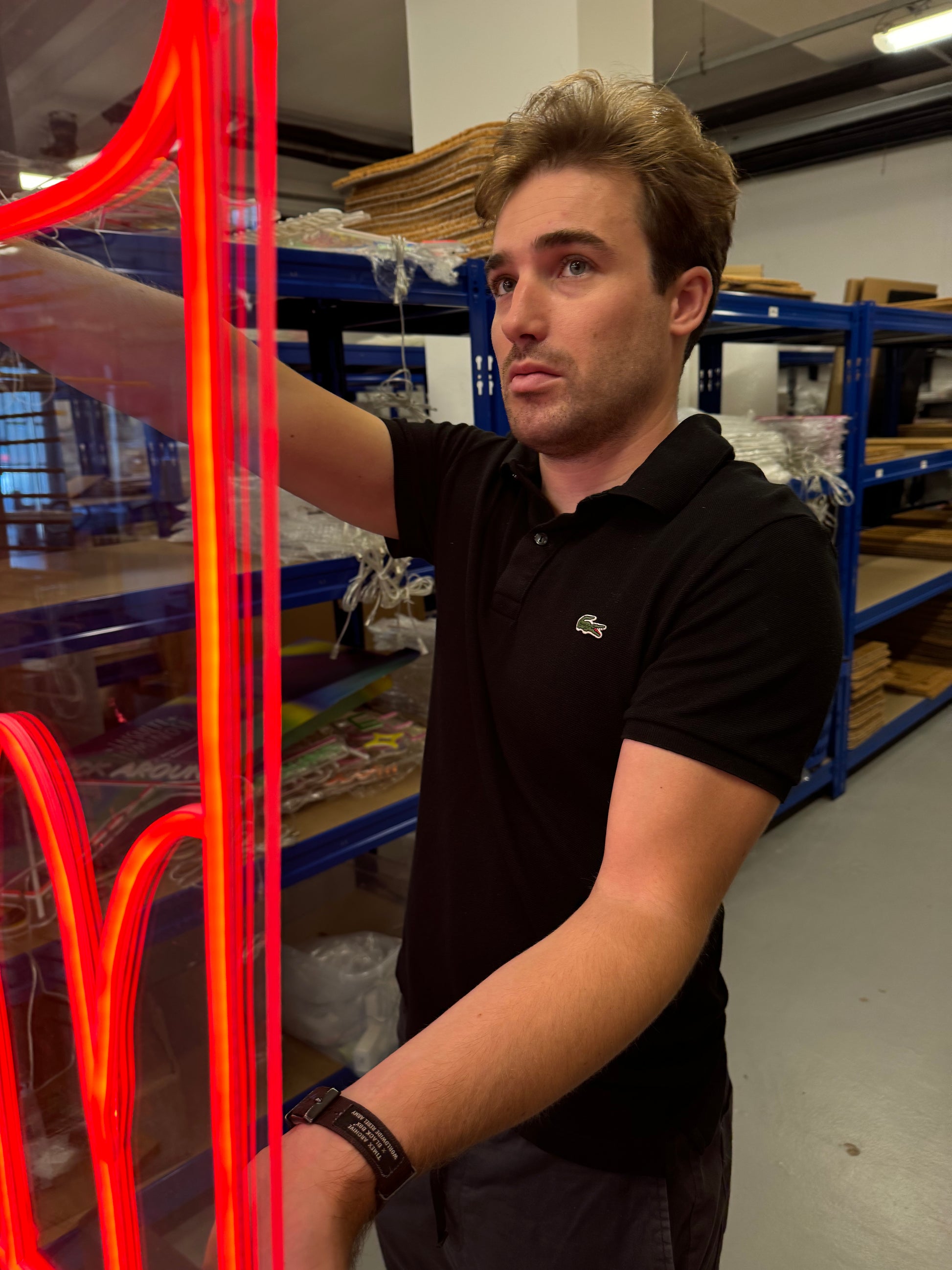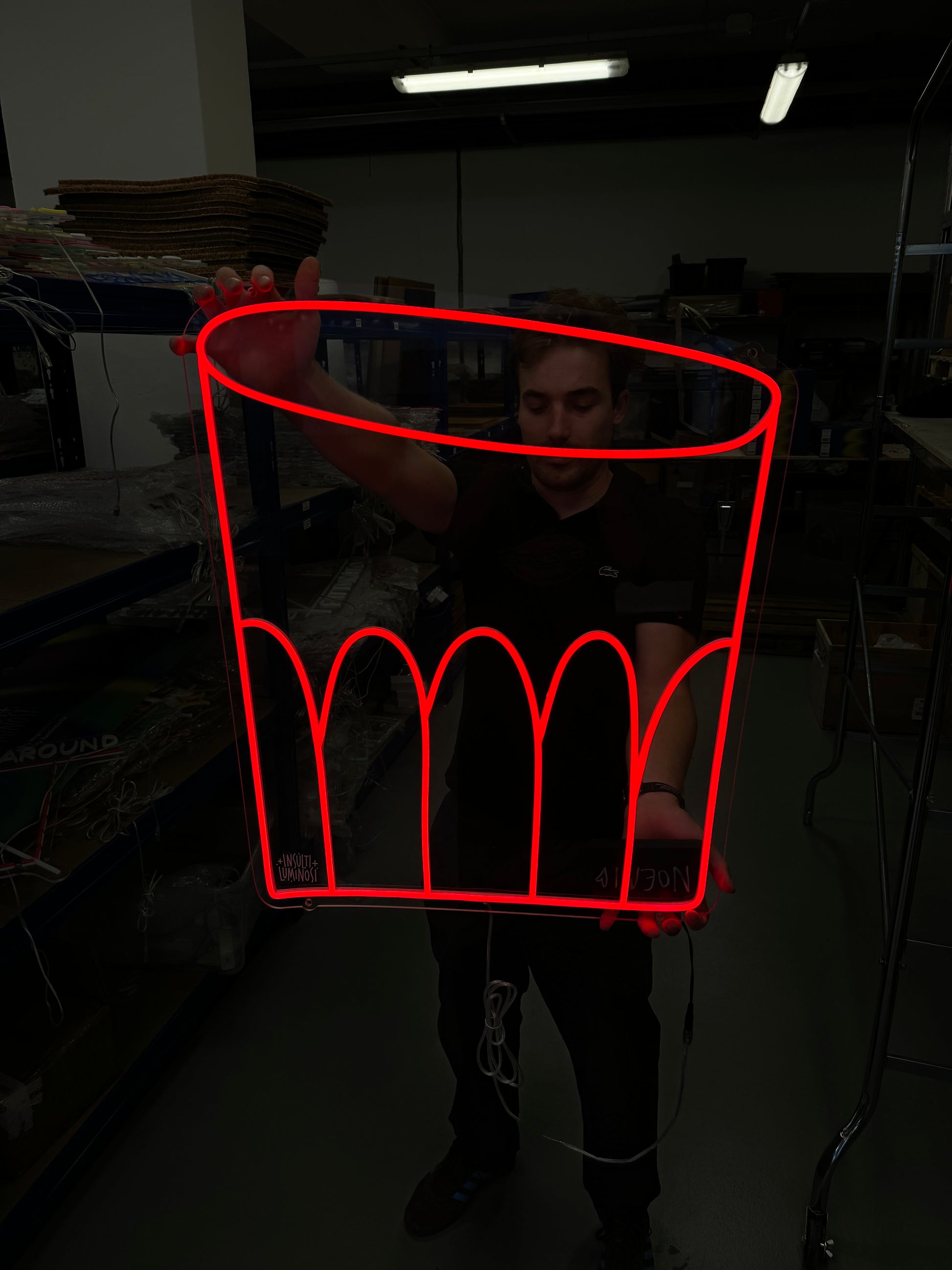 L'insegna è composta da strisce led colorate su pannello in plexiglass trasparente. Il pannello è forato per consentire l'appensione a parete del prodotto.