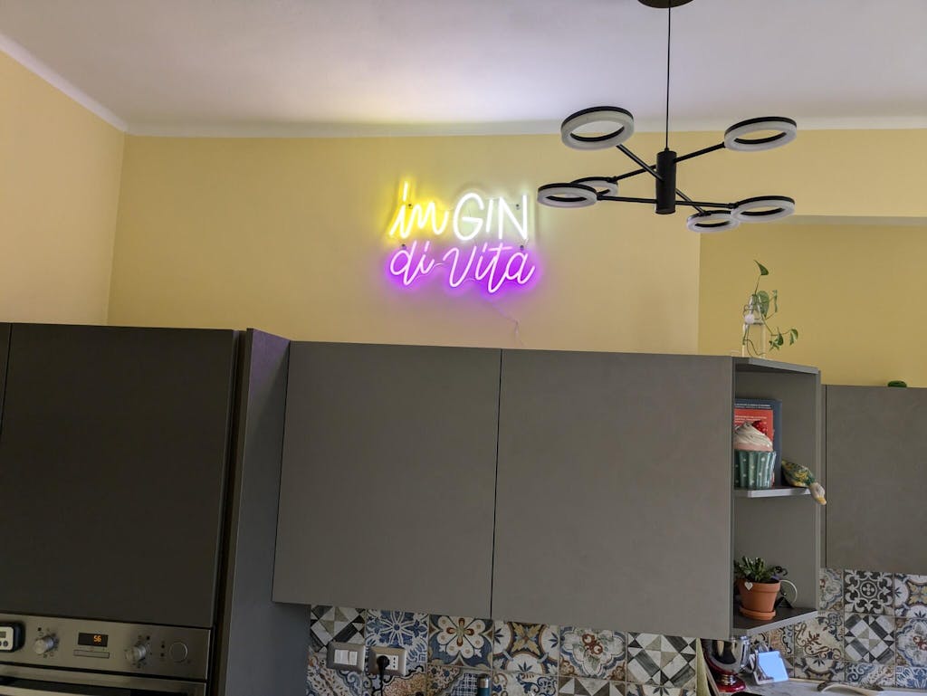 Scrittina led "IN GIN DI VITA", composta al 40% di imprecazioni e al 60% di luminosità.