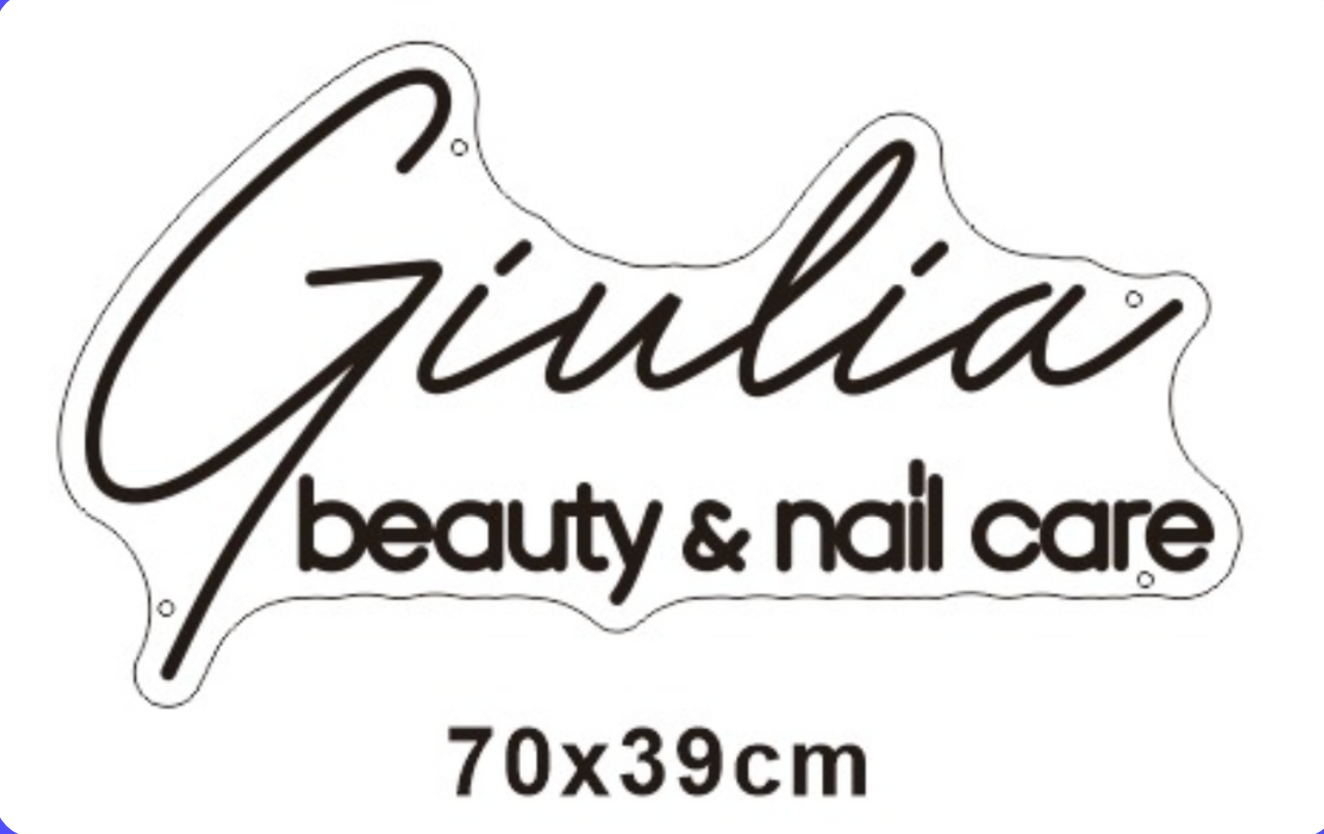 L'insegna è composta da strisce led colorate su pannello in plexiglass trasparente. Il pannello è forato per consentire l'appensione a parete del prodotto.