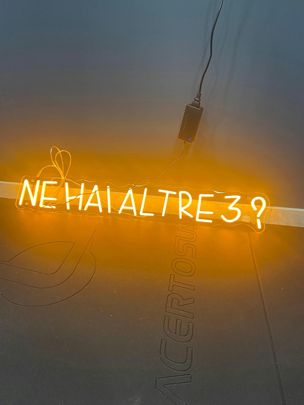 L'insegna è composta da strisce led colorate su pannello in plexiglass trasparente. Il pannello è forato per consentire l'appensione a parete del prodotto.