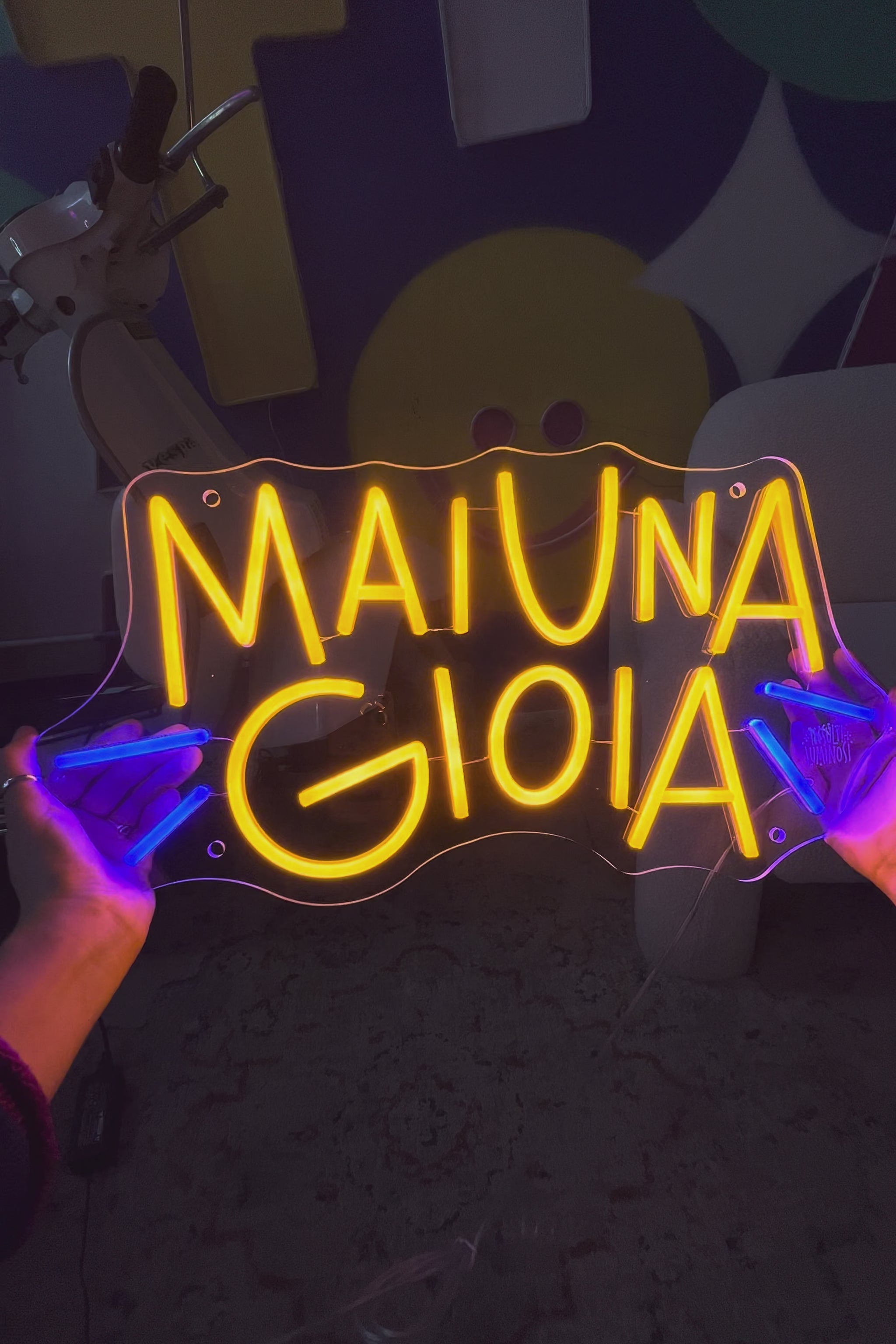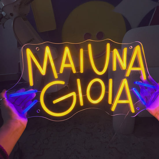 Scrittina led "MAI UNA GIOIA", composta al 40% di imprecazioni e al 60% di luminosità.