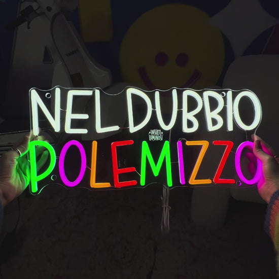 Scrittina led "NEL DUBBIO POLEMIZZO", composta al 40% di imprecazioni e al 60% di luminosità.