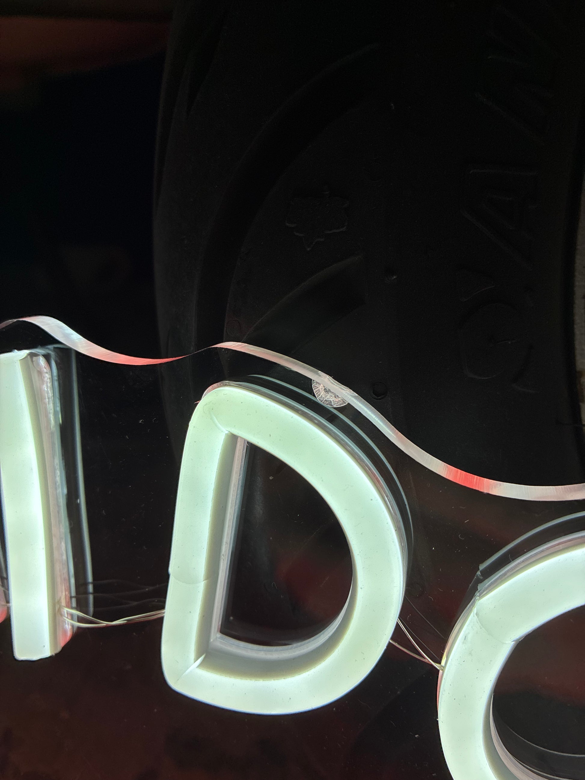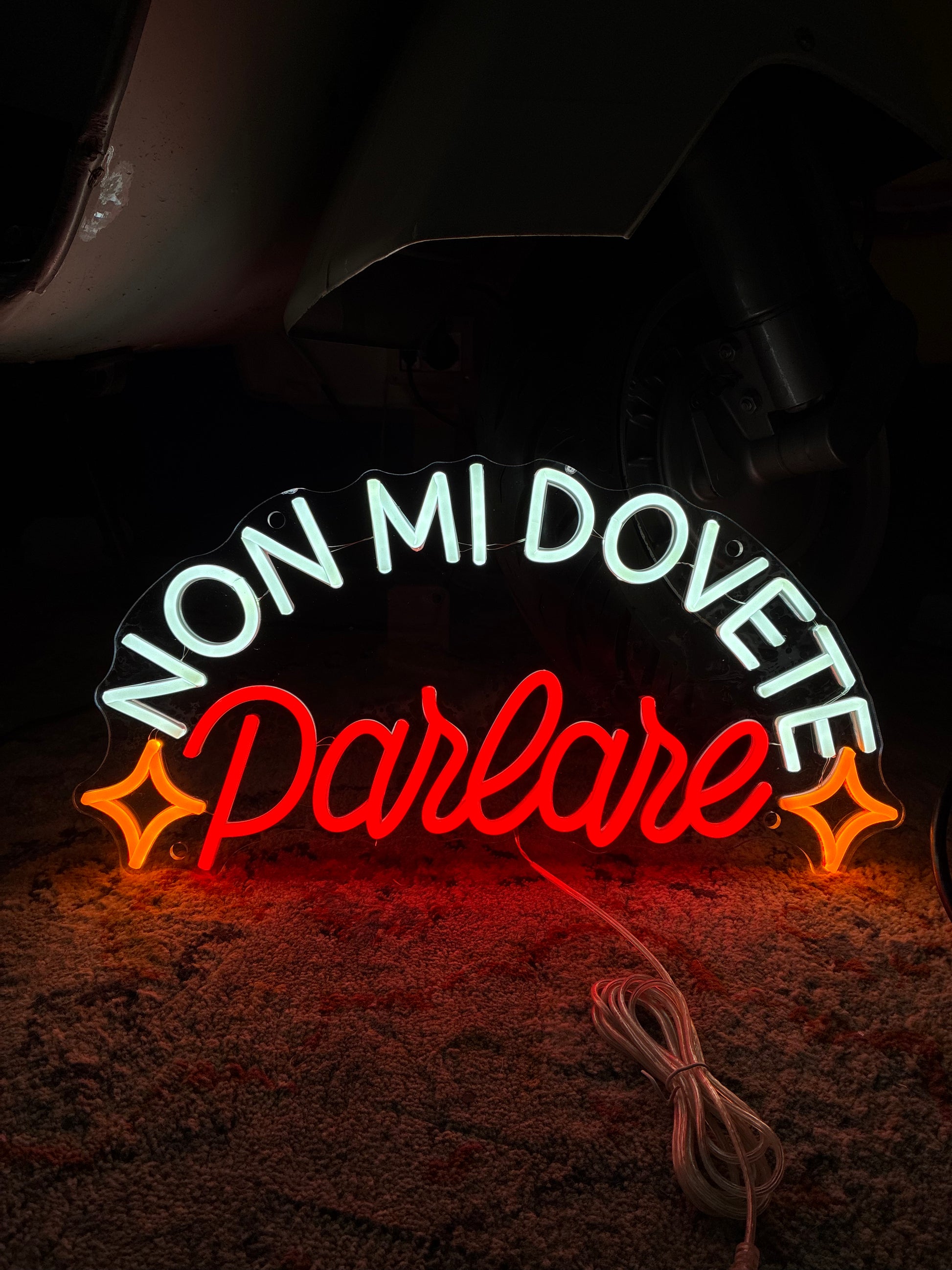 Scrittina led "NON MI DOVETE PARLARE", composta al 40% di imprecazioni e al 60% di luminosità.