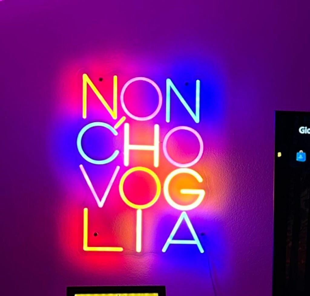 Scrittina led "NON C'HO VOGLIA", composta al 40% di imprecazioni e al 60% di luminosità.
