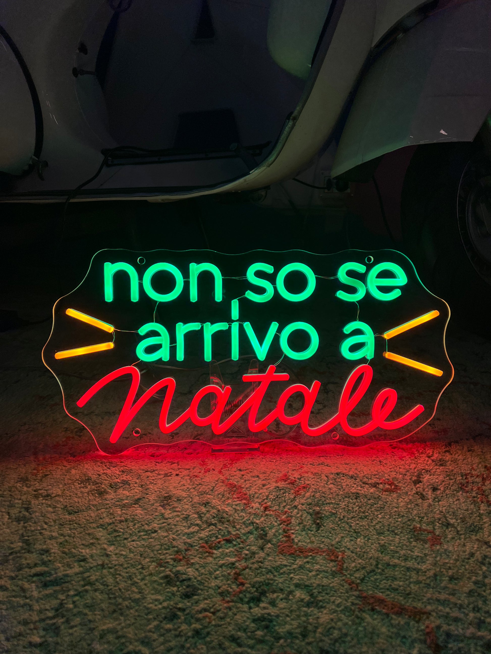 Scrittina led "NON SO SE ARRIVO A NATALE", composta al 40% di imprecazioni e al 60% di luminosità.