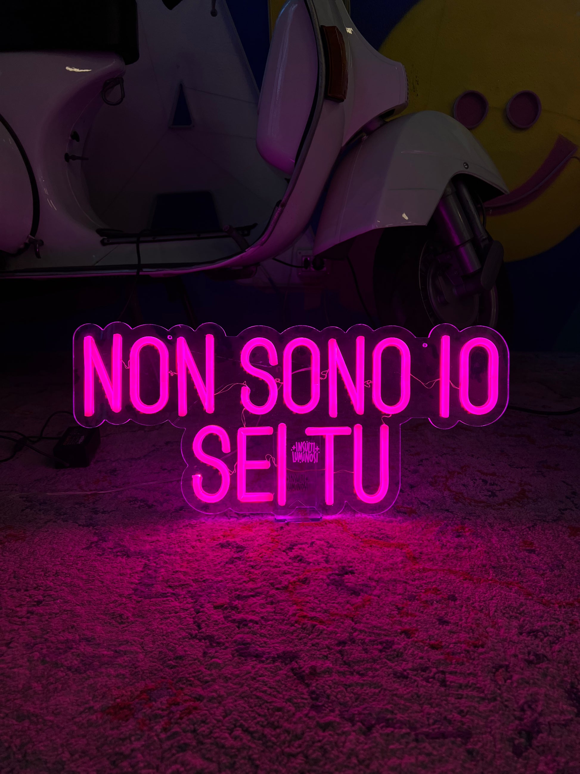 Scrittina led "NON SONO IO SEI TU", composta al 40% di imprecazioni e al 60% di luminosità.
