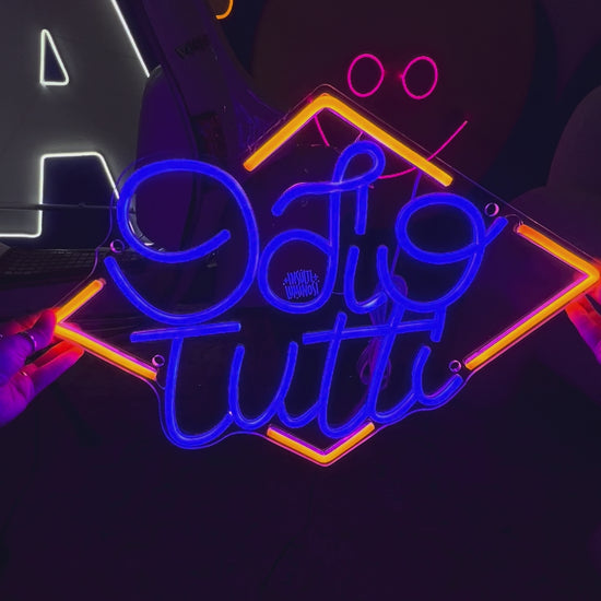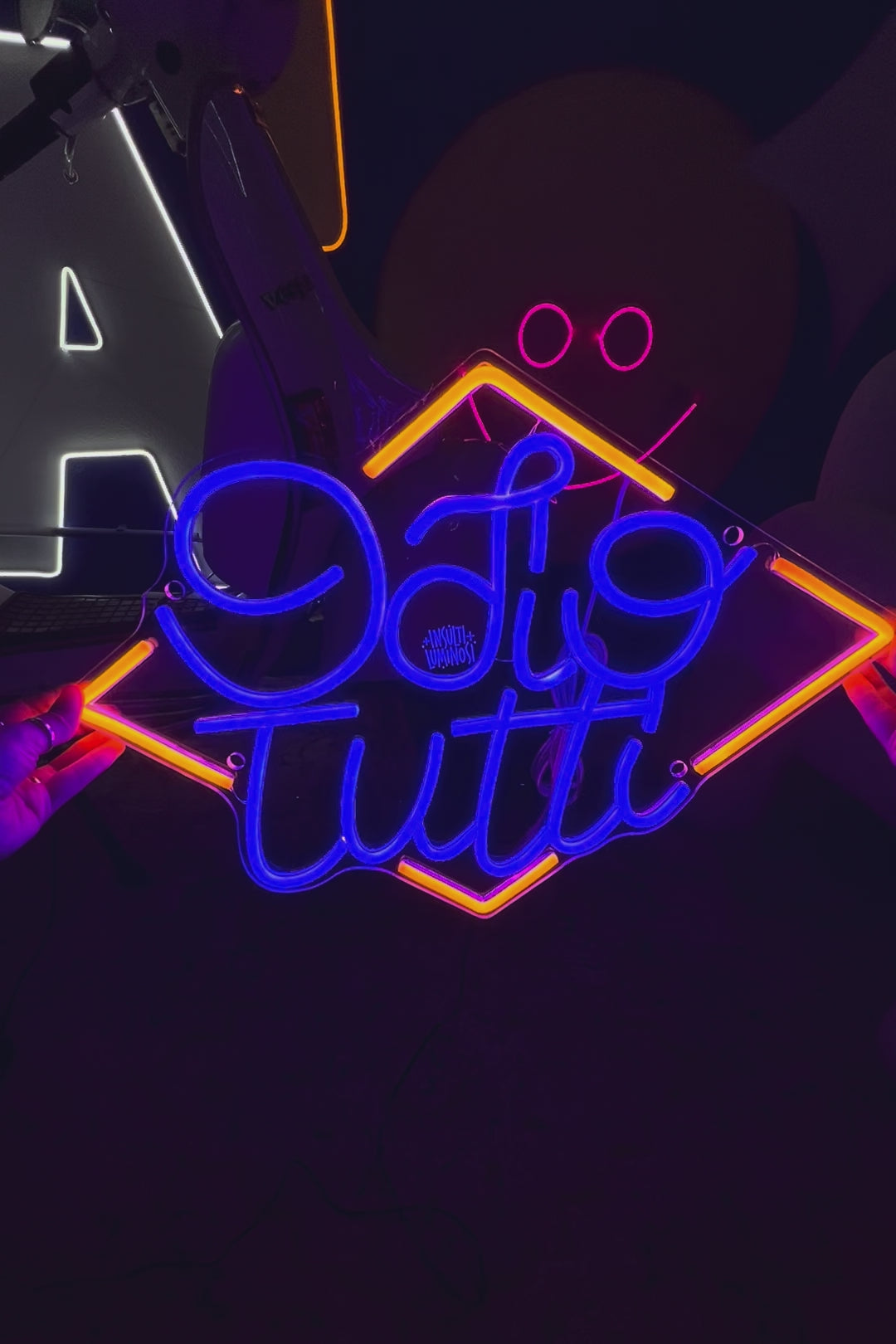 Scrittina led "ODIO TUTTI", composta al 40% di imprecazioni e al 60% di luminosità.