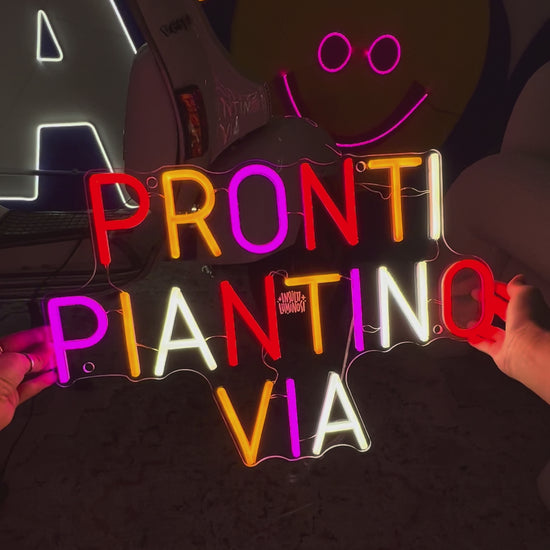 Scrittina led "PRONTI PIANTINO VIA", composta al 40% di imprecazioni e al 60% di luminosità.