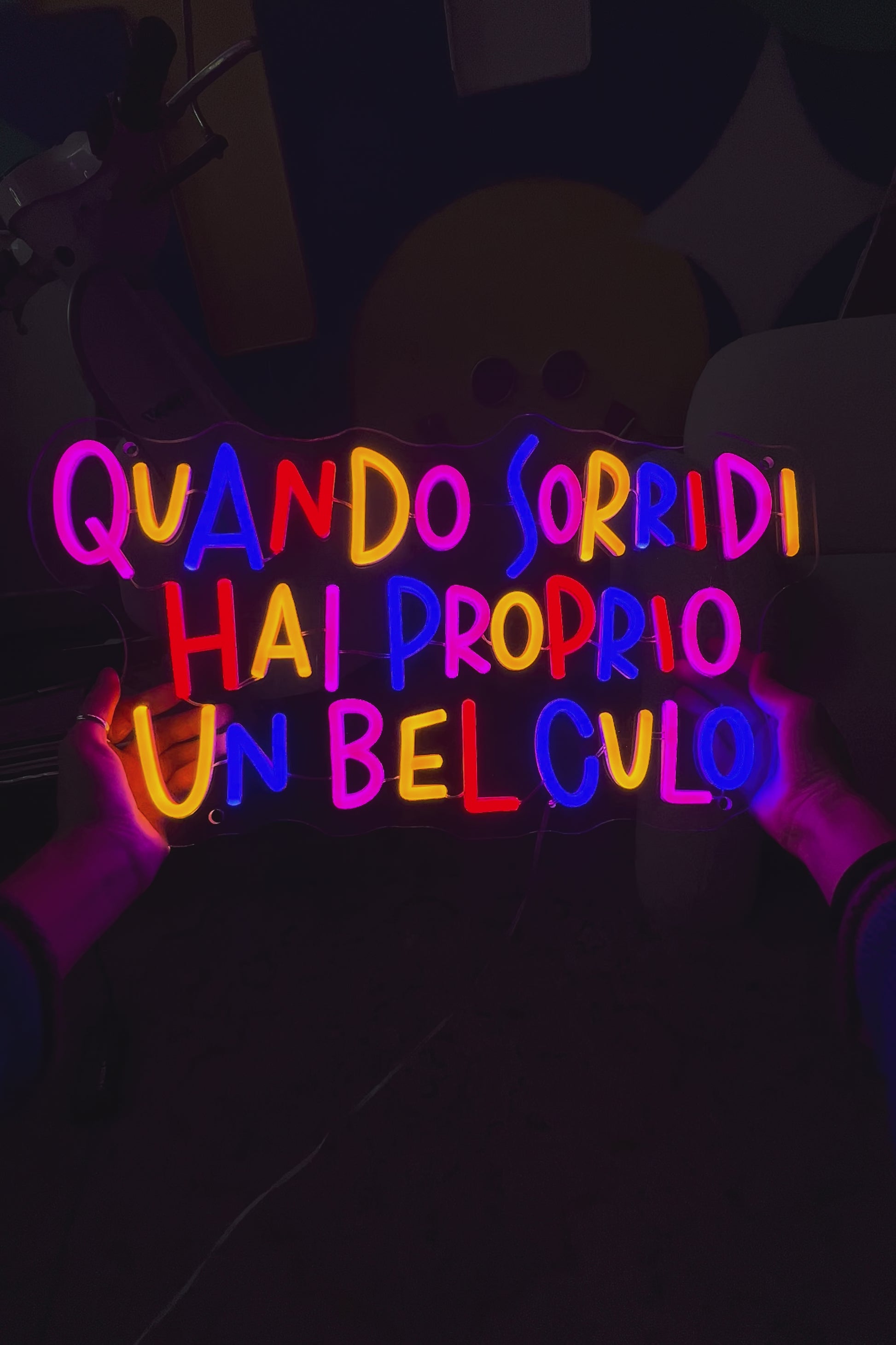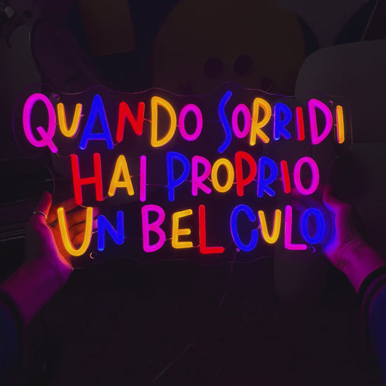 Scrittina led "QUANDO SORRIDI HAI PROPRIO UN BEL CULO", composta al 40% di imprecazioni e al 60% di luminosità.