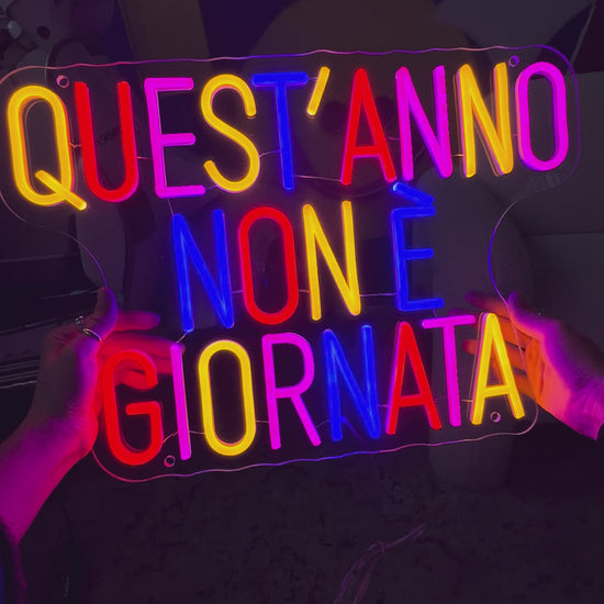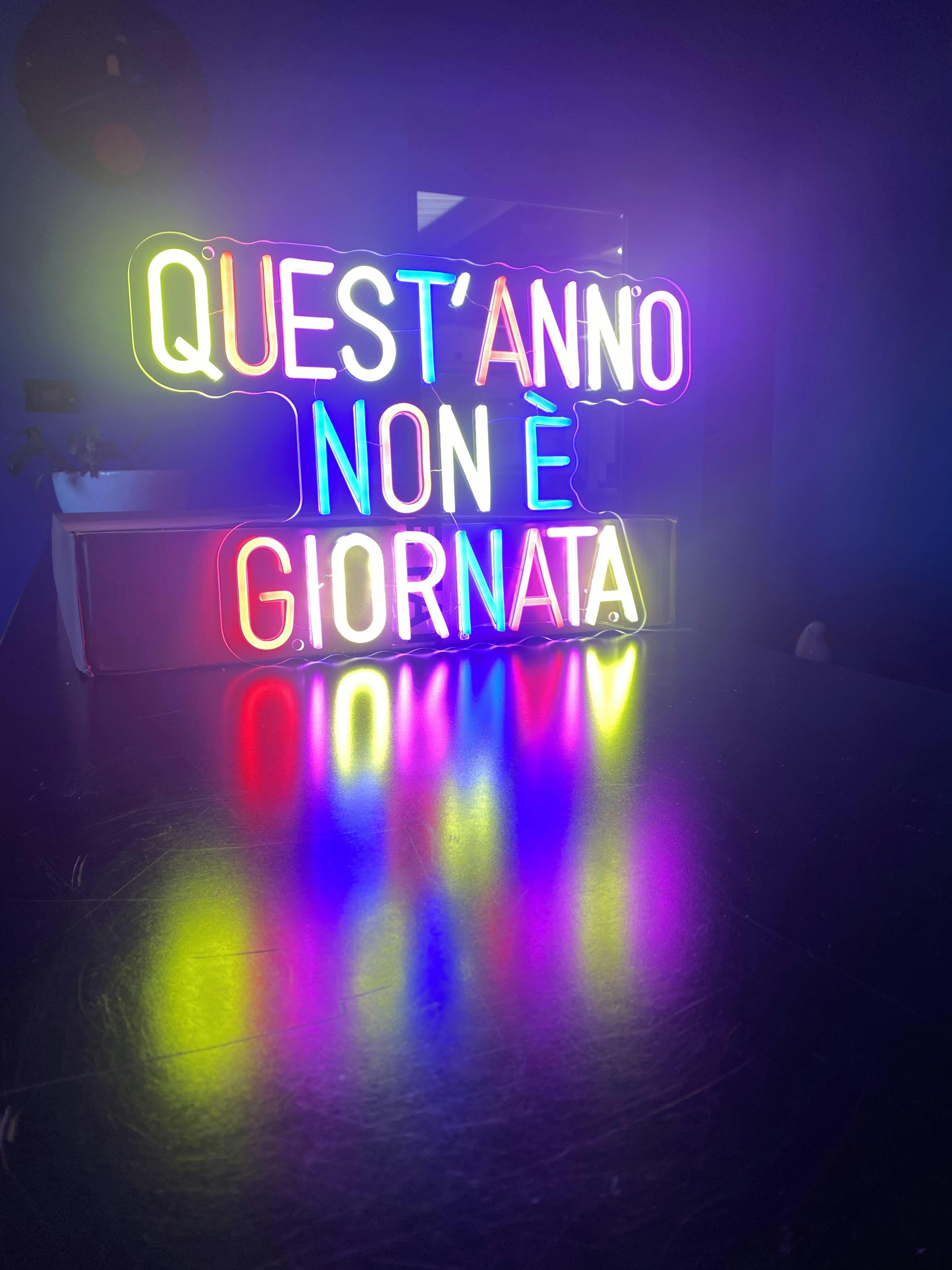 Scrittina led "QUEST’ANNO NON È GIORNATA", composta al 40% di imprecazioni e al 60% di luminosità.