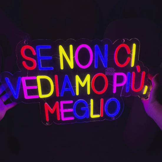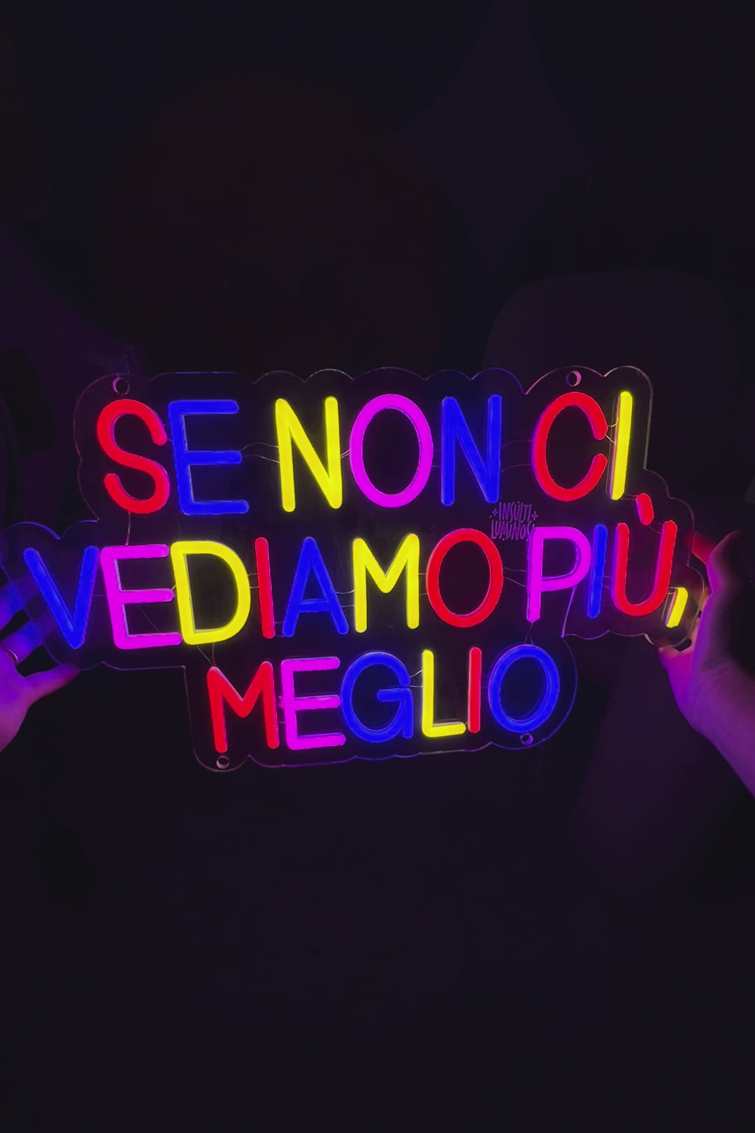 Scrittina led "SE NON CI VEDIAMO PIÙ, MEGLIO", composta al 40% di imprecazioni e al 60% di luminosità.