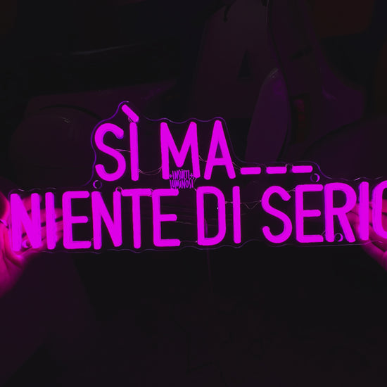 Scrittina led "SI MA… NIENTE DI SERIO", composta al 40% di imprecazioni e al 60% di luminosità.