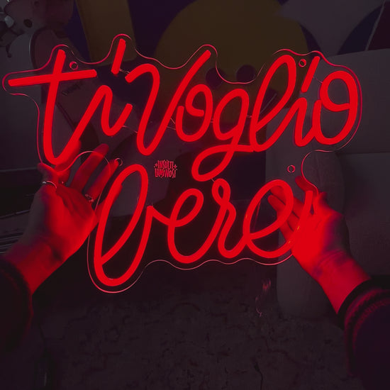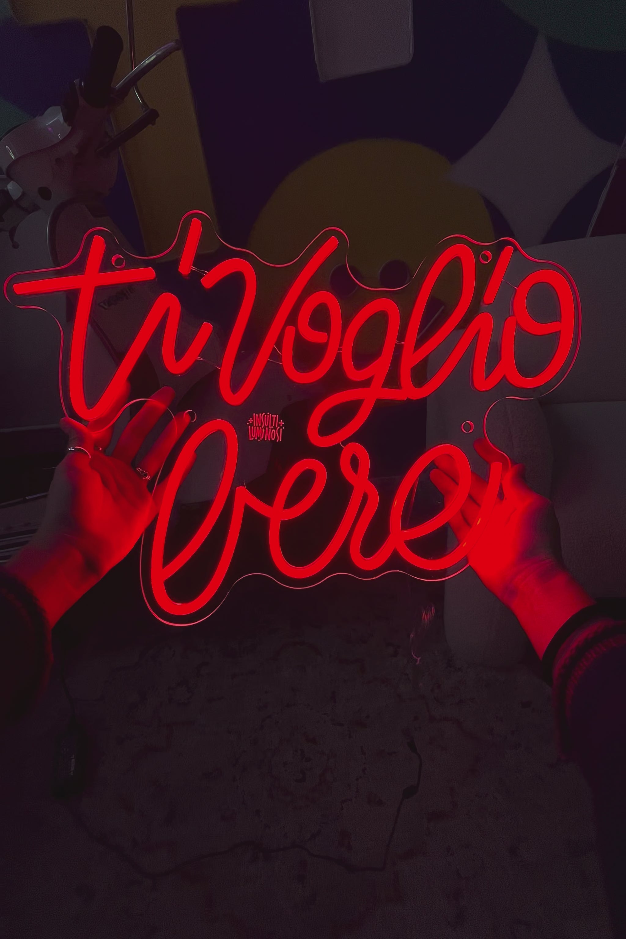 Scrittina led "TI VOGLIO BERE", composta al 40% di imprecazioni e al 60% di luminosità.