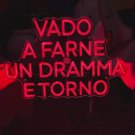 Scrittina led "VADO A FARNE UN DRAMMA E TORNO", composta al 40% di imprecazioni e al 60% di luminosità.