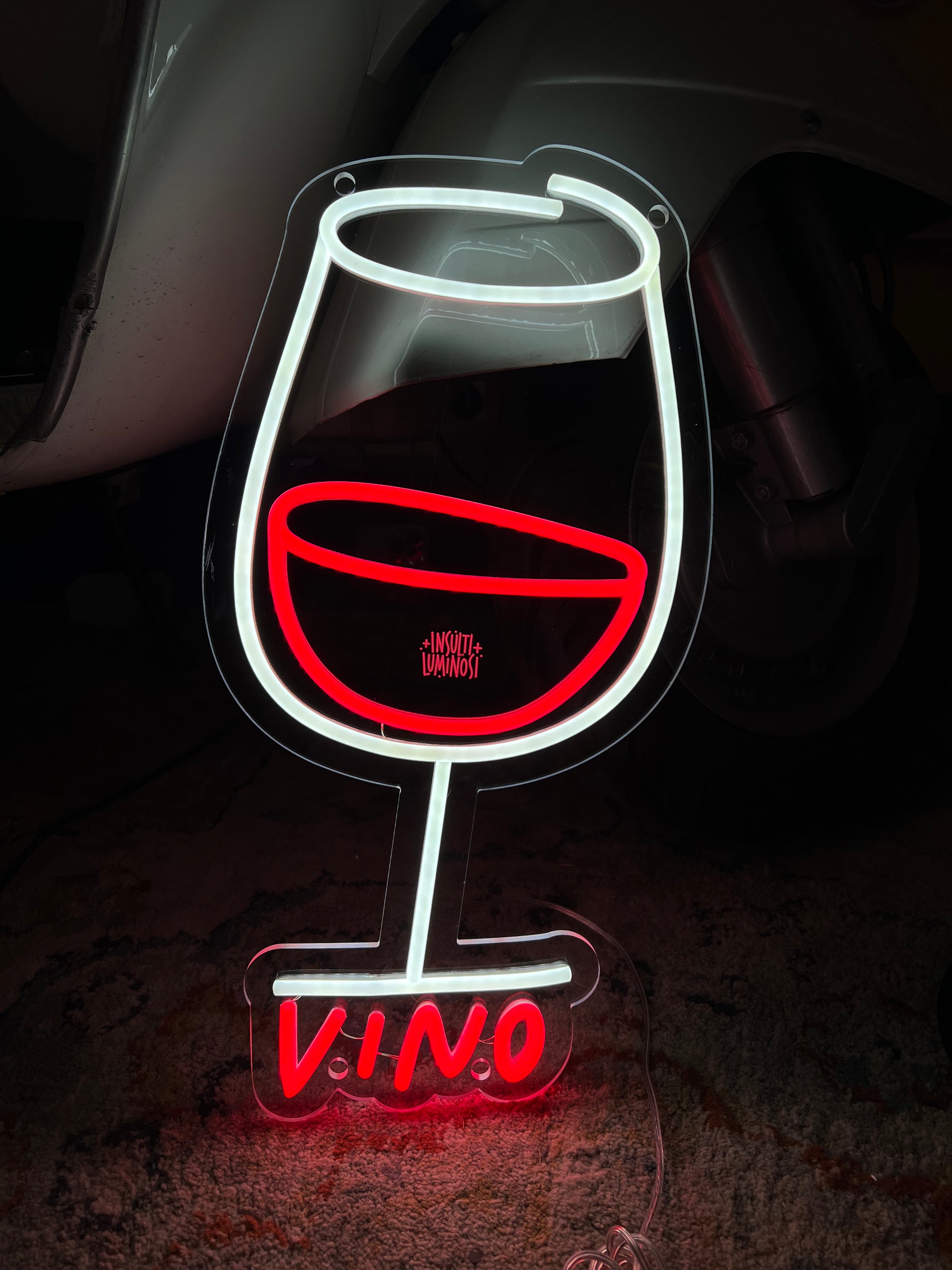 Scrittina led "VINO", composta al 40% di imprecazioni e al 60% di luminosità.