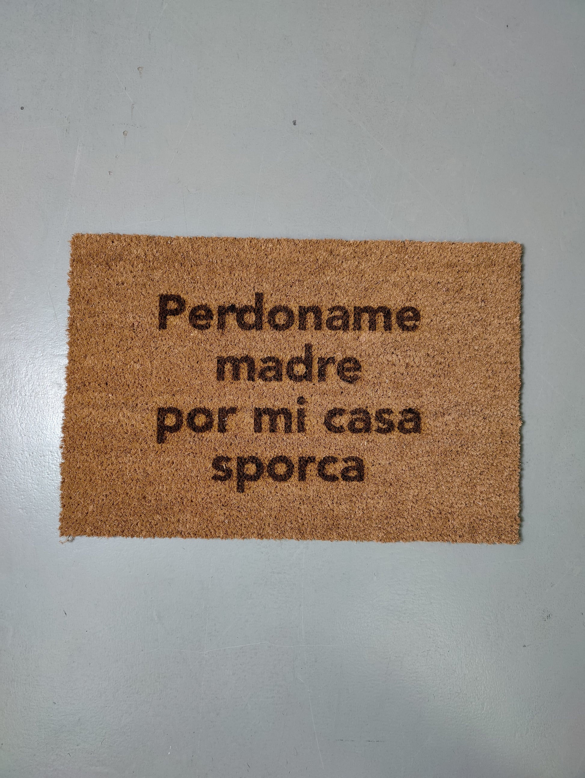 Zerbino in fibra di cocco e base antiscivolo in lattice naturale “Perdoname madre por mi casa sporca”.